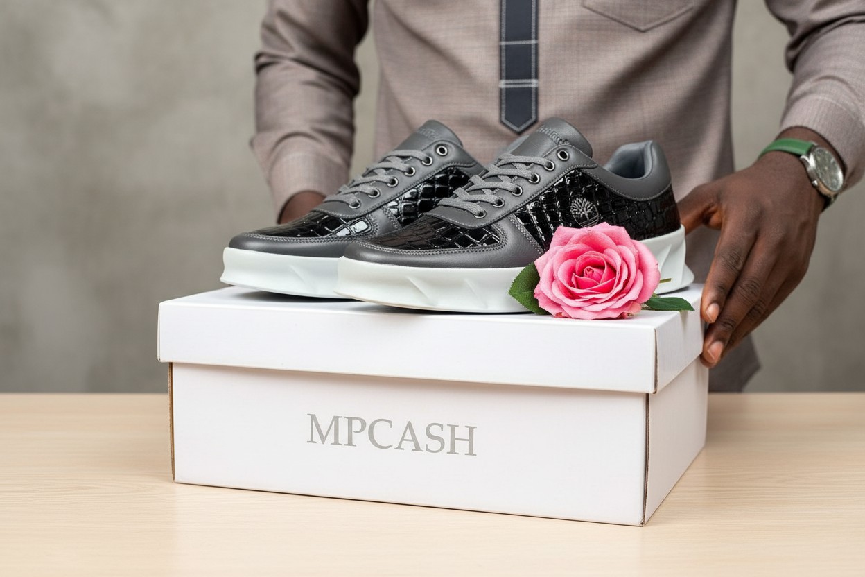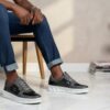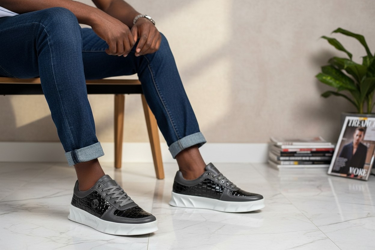 Le contraste gris mat et noir brillant effet croco crée un style dynamique, idéal pour les hommes qui veulent un look sophistiqué sans excès.