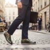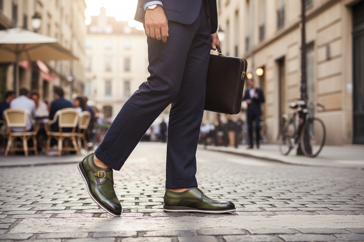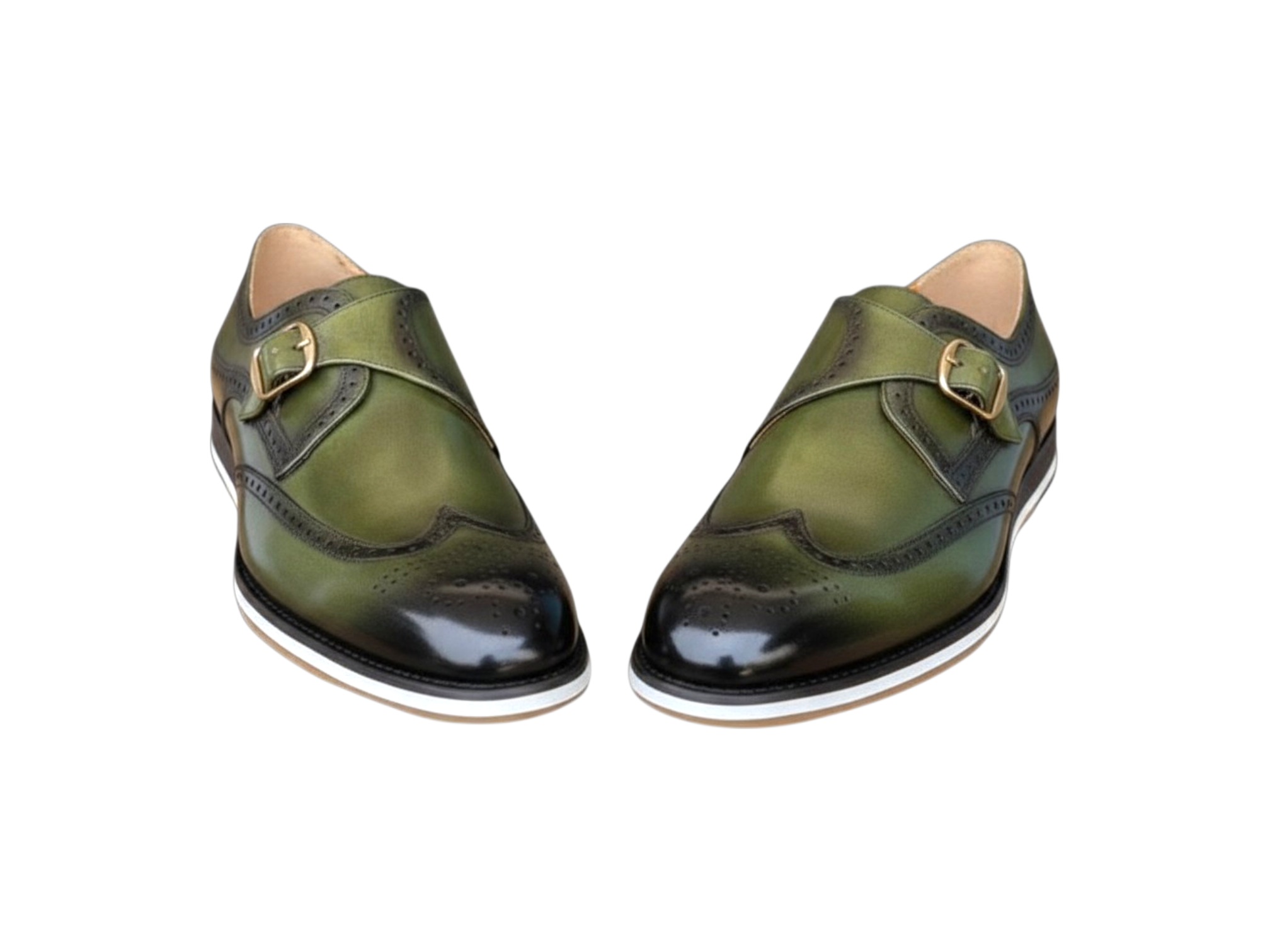 Ce modèle double boucle se distingue par sa finition vert patiné, offrant un rendu unique, sophistiqué et moderne. Son design travaillé avec perforations décoratives et lignes élégantes renforce son caractère haut de gamme.