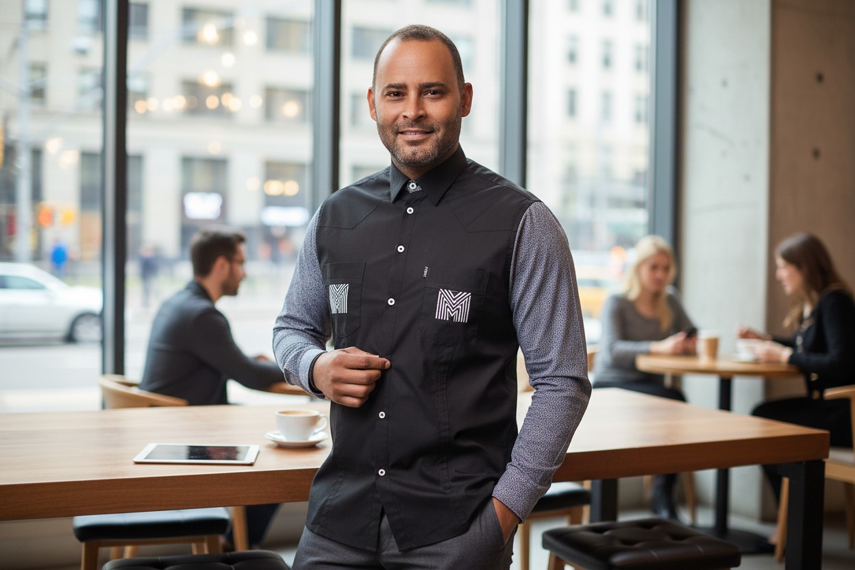 Cette tenue se distingue par son contraste harmonieux entre le tissu principal et les manches, créant un style raffiné et contemporain. Les détails graphiques intégrés au niveau des poches apportent une touche moderne qui renforce le caractère unique de cette chemise.