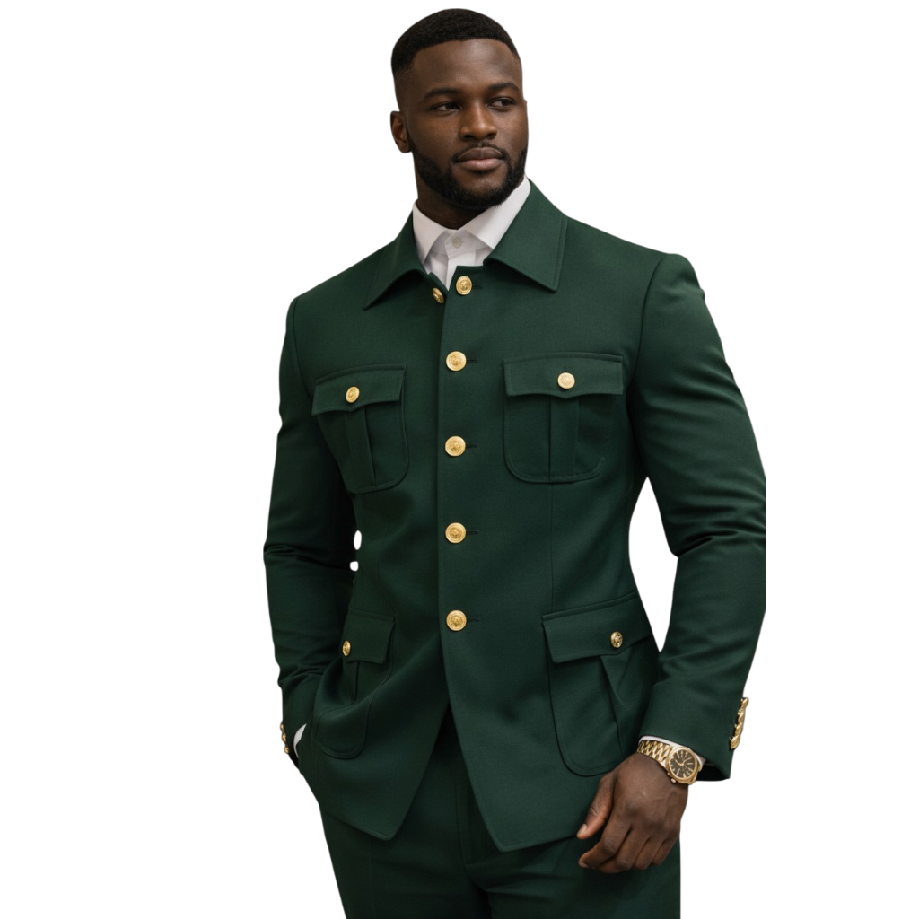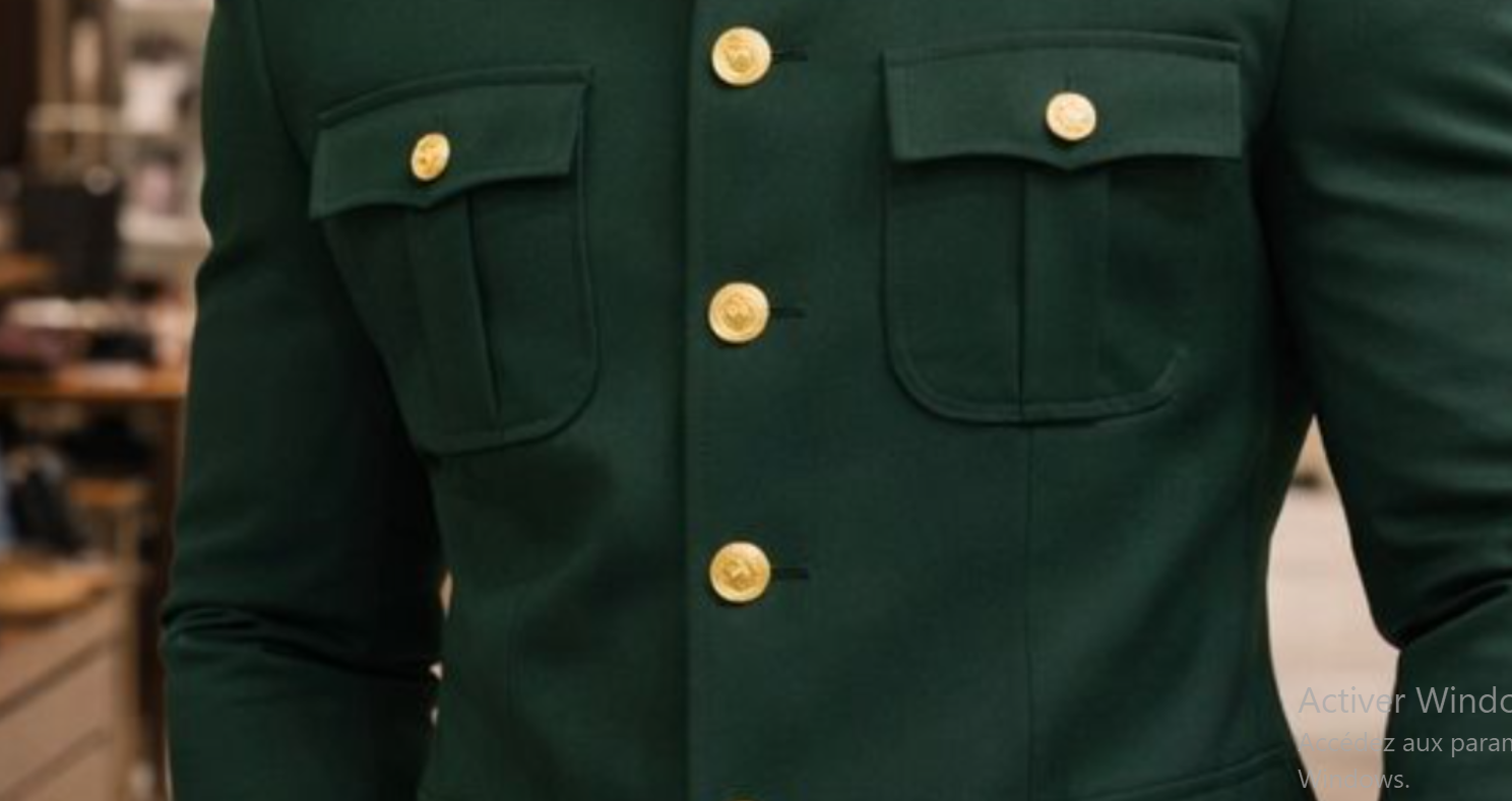 Sa couleur verte profonde associée à des boutons dorés apporte une touche de luxe et de distinction, idéale pour les événements, les sorties importantes ou un style quotidien raffiné.