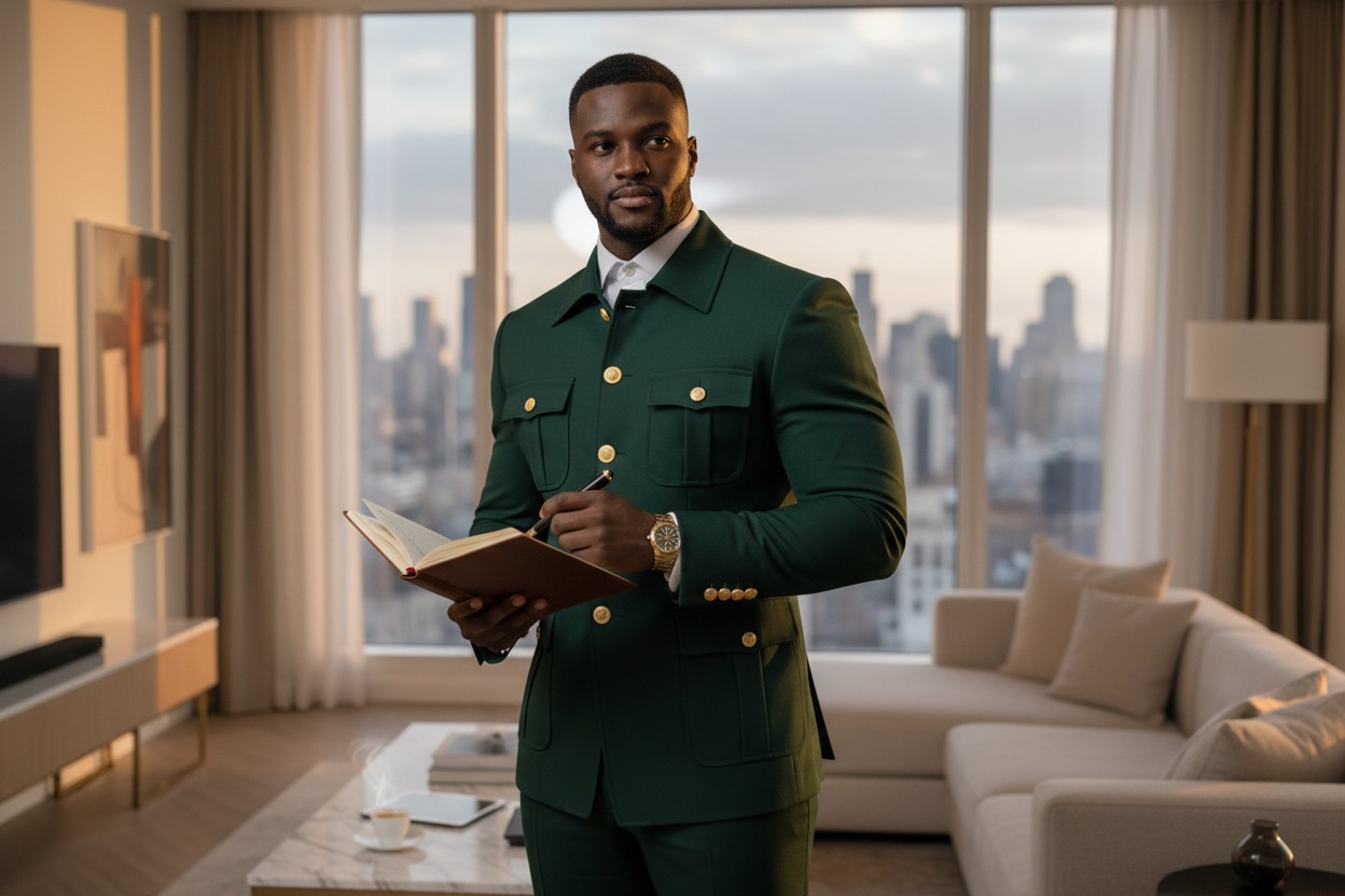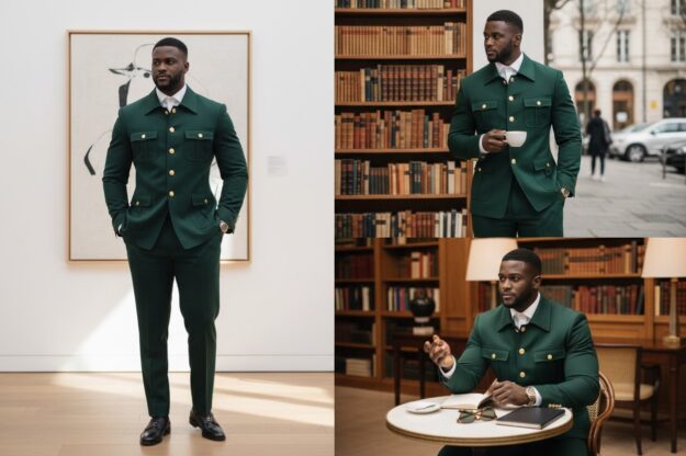 Sa coupe structurée met en valeur la silhouette masculine tout en offrant un confort optimal. Chaque détail a été pensé pour refléter le prestige, la modernité et la confiance.