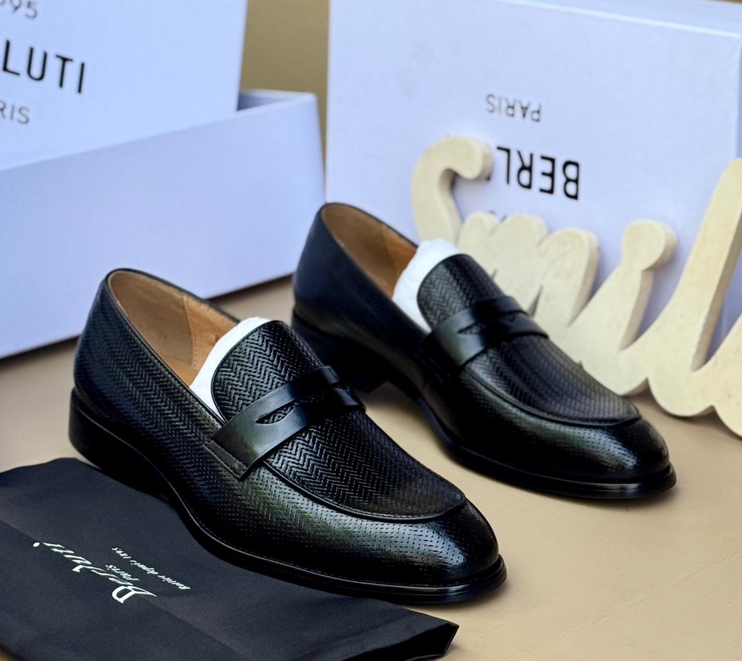 Le cuir texturé apporte une finition moderne et luxueuse, tandis que la bande décorative sur le dessus renforce le caractère élégant de la chaussure. Le design épuré et intemporel permet de porter ces mocassins aussi bien avec un costume qu’avec une tenue chic.
