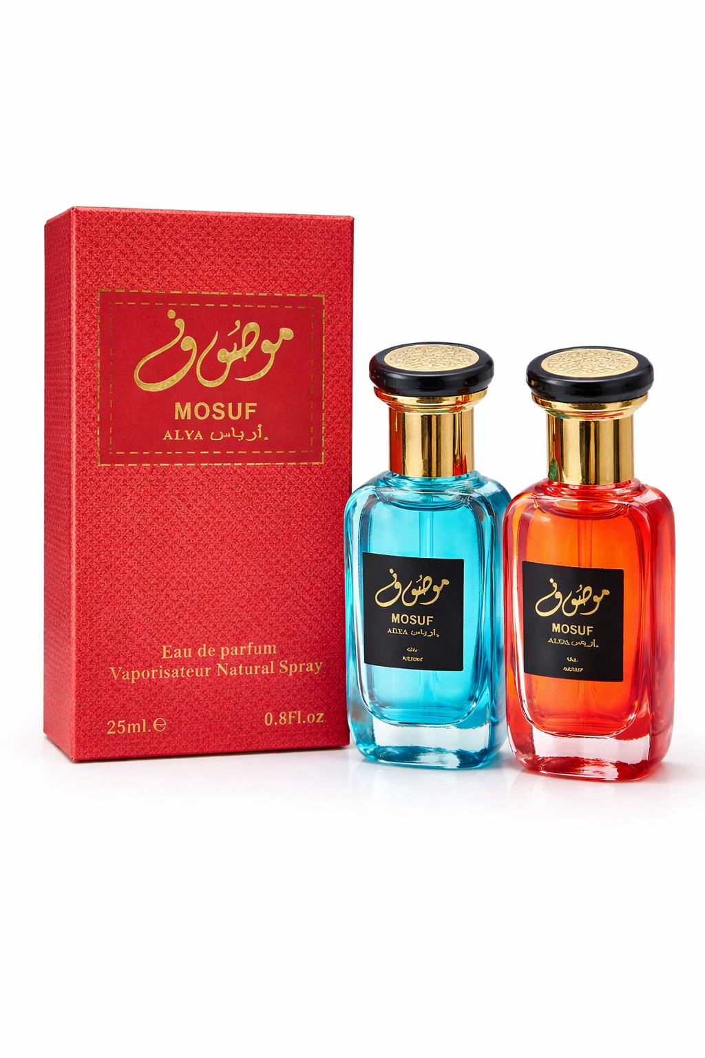 MOSUF Alya Eau de Parfum est proposée en duo de 25 ml dans un coffret rouge luxueux. Chaque flacon présente un parfum unique avec un design élégant et moderne.