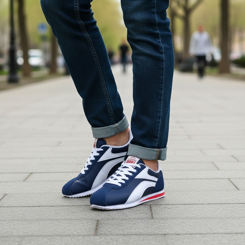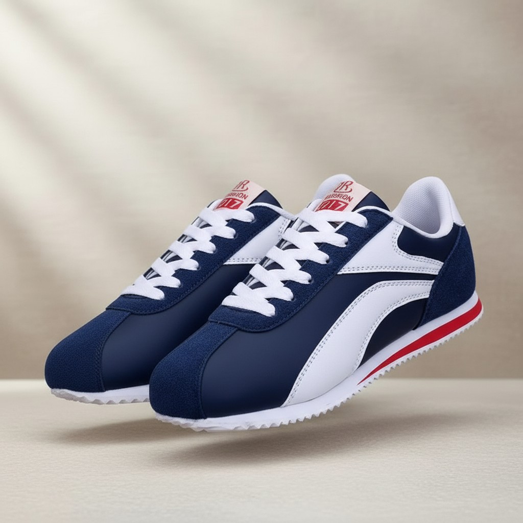 Adoptez un style moderne et dynamique avec ces sneakers premium bleu marine et blanc, conçues pour offrir un équilibre parfait entre design sportif, élégance et confort durable.