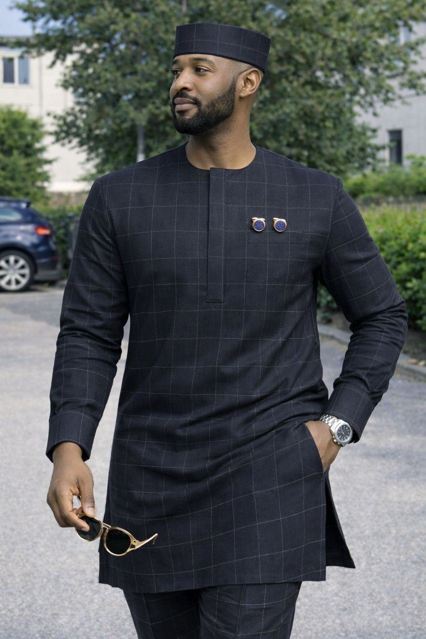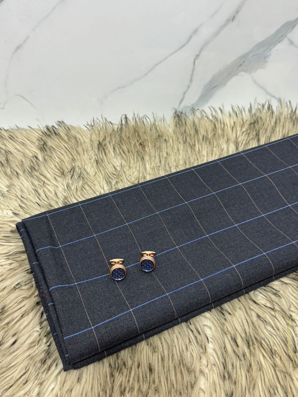 Apportez une touche de modernité et de distinction à votre tenue avec ce tissu gris à carreaux haut de gamme , livré en 3 mètres et accompagné de boutons de manchette assortis .